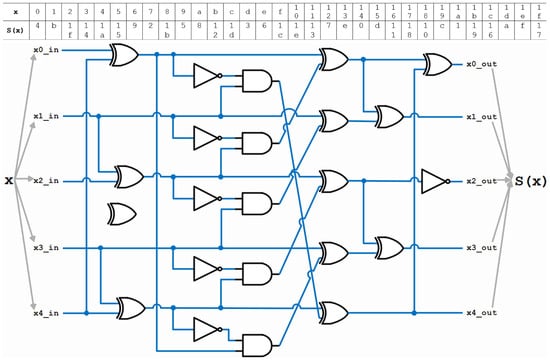 Figure 3 provides both the look-up table and the logic gates layer for S, with representing the most significant bit (MSB) and as the least significant bit (LSB). Since 5-bit variables can only range from 0 to in the hexadecimal form, the result of the S-box function is predictable and can be implemented as a look-up table, as shown in Figure 3. However, the look-up table approach will consume many hardware resources, therefore, a special layer with only logic gates is used instead to minimize the area and boost the performance for , with Ascon’s substitution in just one clock cycle.