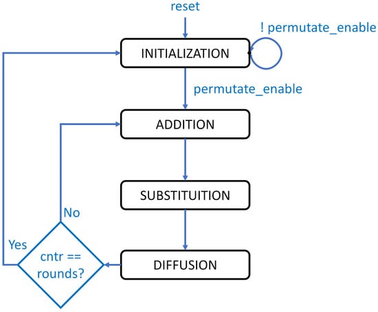 A Finite State Machine (FSM) for Ascon’s permutation is designed, as shown in Figure 5, allowing the module to permutate with the corresponding input number of rounds. The FSM of Ascon permutation has a total of four states and is adaptable. It can operate for an arbitrary number of rounds besides the expected 6 rounds, 8 rounds, and 12 rounds used by Ascon.