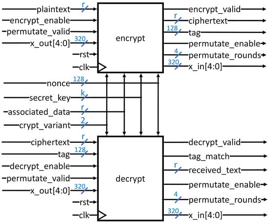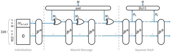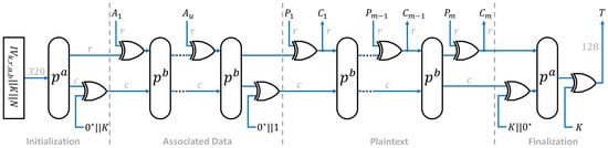 . The Ascon cipher suite embraces the sponge construction to its authenticated encryption schemes, along with hash and extendable output functions []. The family of Ascon algorithms is parameterized by permutation round numbers a and b and message input in the form of data blocks with size (rate) r.