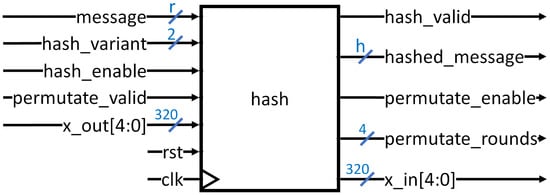 The Ascon hashing module, implemented in hardware using Verilog, features a total of seven input ports and five output ports, as depicted in Figure 7. These ports are carefully designed to facilitate the hashing process, with specific ports allocated for the permutation operations that are integral to Ascon’s hashing algorithm.