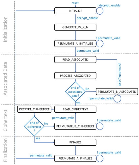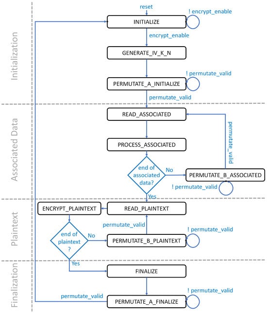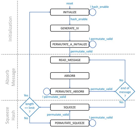 To manage the complexity of the hashing process, an FSM was designed specifically for Ascon’s hashing operations, as illustrated in Figure 8, orchestrating the sequence of states required to carry out the hashing functions efficiently. The FSM ensures that each step of the hashing process is executed in the correct order, handling the transitions between states with precision. This design is essential for achieving reliable and high-performance hashing within the hardware implementation of the Ascon.