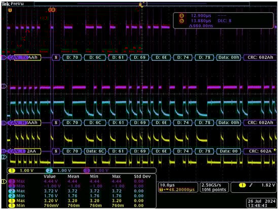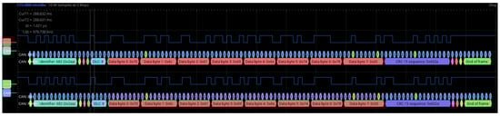 The CAN bus is described by a data link layer and a physical layer, as specified in ISO 11898-1 and ISO 11898-2 standards []. Nearly every type of vehicle, including automobiles, trucks, buses, tractors, motorcycles, ships, aircraft, and EV batteries, has the CAN bus as the standard. The CAN bus offers durability, which makes it ideal for situations where safety is a top priority.