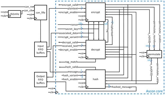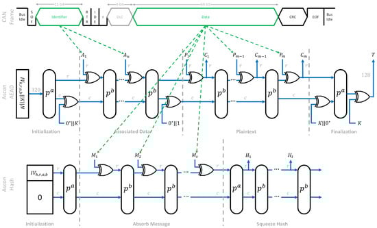 The fact that many automotive components have limited resources and computing capability makes tasks such as encryption difficult, which is one of the key issues with embedded security. Broadcasting and multi-casting are typically employed in vehicle networks to send messages simultaneously to several receivers. Consequently, a wide range of needs arise, from high throughput to area-constraints with regards to message authentication for all intended recipients. In Authenticated Encryption with Associated Data (AEAD), a message is encrypted while producing an authentication tag, thus providing a comprehensive solution to security problems, ensuring both privacy and trustworthiness of the communication []. The technique combines the cryptography functions of authentication, integrity, and confidentiality into a single algorithm and uses less resources than conventional encryption. In other words, in addition to encrypting the message, the AEAD algorithm also encrypts the sender’s associated data and creates a tag, also known as a Message Authentication Code (MAC), to verify that the data have not been tampered with. In this way, every block of cipher text contains not only the encrypted message but also the identity of the sender.