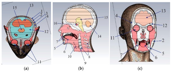 A three-dimensional lifelike model of a mobile phone user comprises sixteen biological tissues and organs: skin, fatty tissue, muscle, skull, mandible, tongue, eyes, teeth, vertebrae, cartilage, thyroid gland, cerebrospinal fluid, cerebrum, cerebellum, brain stem, and hypophysis. The anterior and side views of a realistic 3D head model are presented in Figure 1a and Figure 1b, respectively. Transverse, sagittal, and coronal cross-sections are represented in Figure 2a, Figure 2b and Figure 2c, respectively.