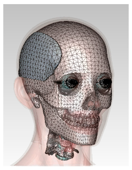 A 3D model of a cranial implant is created using 3D images of real implants, installed due to existing bone tissue defects or defects resulting from certain surgical interventions. A model of a cranial implant used in our simulations is presented in Figure 3. The implant is placed on the right side of the head, i.e., the same side as the electromagnetic field radiation (mobile phone) source.