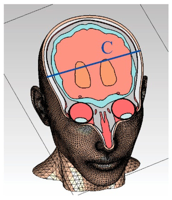 First, we investigated the distribution of the electric field in the transverse cross-section presented in Figure 6, for the case with and without a cranial implant. The position of the plane corresponds to the position of the mobile phone antenna, i.e., the position of the titanium cranial implant. A calculation line C at the transversal plane and perpendicular to the mobile phone is presented in Figure 6 as well.