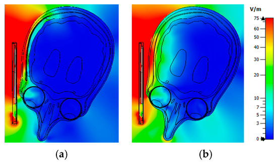 Electric field distribution within the user’s head model: (a) with cranial implant and (b) without cranial implant.