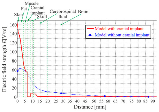 From Figure 8, it can be also seen that the electric field intensity for the model without the cranial implant drops to a value close to zero after a penetration depth of about 70 mm. The depth of the electric field penetration is significantly smaller in the model with a cranial implant and is close to 25 mm, which results in electric field values inside the brain of less than 1 V/m.
