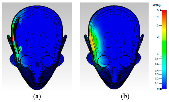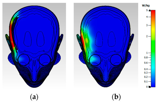 Spatial distribution of SAR1g inside the user’s head model: (a) with cranial implant and (b) without cranial implant.