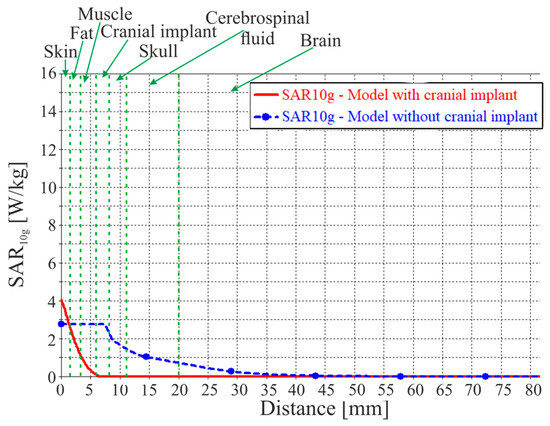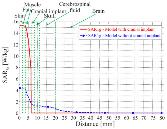 As in the case of electric field intensity, the largest deviation of SAR1g is noticeable inside the skin, where the maximum value of SAR1g for the model with a cranial implant is 11.05 W/kg higher, compared to the value obtained for the model without this implant. The maximum value of SAR1g inside the skin, for the model with the cranial implant, is 15.42 W/kg, while this value is 4.37 W/kg for the model without the implant. A slightly smaller difference for the maximum value of SAR1g was obtained within fatty tissue and amounts to 10.89 W/kg. A similar difference can be observed also within muscle tissue and amounts to 10.83 W/kg. According to the graph shown in Figure 11, it can be noticed that the value of SAR1g inside the tissues behind the cranial implant (skull, cerebrospinal fluid, and brain) falls to a value of 0 W/kg, while those values for the model without the cranial implant are 1.73 W/kg, 1.24 W/kg, and 0.78 W/kg, respectively.