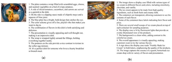 To generate descriptive content from food images, we designed a prompt specifically to guide the response of the language model. Given the sensitivity of the output to the phrasing of the prompt, we experimented with several versions and ultimately settled on the following: “Describe what this food image looks like and what ingredients it might contain in sentences. Generate 10 sentences and answer in English”. This prompt was used to input food images into the MiniGPT-4 model, which then generated ten descriptive sentences for each image. Examples of these responses are illustrated in Figure 2a,b.