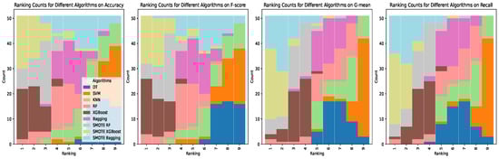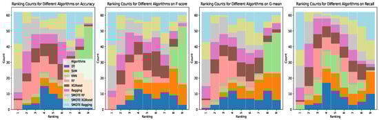 The stacked bar charts in Figure 3 and Figure 4 provide a visual representation of the rankings for different methods across the four key metrics (accuracy, F-score, G-mean, and recall) for both datasets: