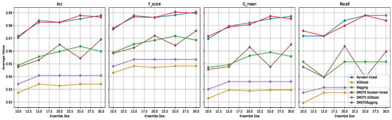 In Figure 8, a similar trend is observed for the CMU dataset. Increasing the ensemble size initially improves accuracy, F-score, and recall, but the impact on G-mean is more variable due to the imbalanced nature of the dataset. The results indicate that while larger ensembles can mitigate some effects of class imbalance, over-increasing the ensemble size without adequate diversity among the base models may not significantly enhance model performance. This highlights the importance of balancing ensemble size with model diversity for optimal performance, particularly in imbalanced datasets.