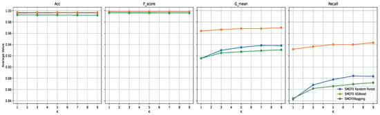The sensitivity analysis of the SMOTE k-value was conducted on the imbalanced CMU dataset, as shown in Figure 9. The k-value in SMOTE determines the number of nearest neighbors considered when generating synthetic samples.