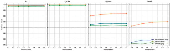 Figure 10 presents the relationship between the imbalance ratio in SMOTE and the four evaluation metrics for the CMU dataset. The imbalance ratio represents the degree of balance between the minority and majority classes after applying SMOTE, with a ratio of 1 indicating a perfectly balanced dataset.
