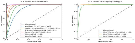Based on the CMU dataset (Figure 11), Random Forest (AUC = 0.99) and XGBoost (AUC = 1.00) consistently outperform other classifiers, showcasing exceptional performance across various thresholds. In the SMOTE-enhanced strategy 1, both Random Forest and XGBoost achieve an AUC of 1.00, while Bagging attains an AUC of 0.97. These findings suggest that SMOTE, combined with ensemble learning techniques, significantly improves classification performance on imbalanced datasets. The results indicate that these approaches not only enhance minority class detection but also ensure reliable and accurate keystroke dynamics authentication across different datasets.