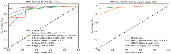 The proposed SMOTE-enhanced ensemble learning methods demonstrated superior performance compared to other commonly used resampling techniques, such as Random Oversampling, Random Undersampling, and ADASYN. Random Oversampling [], while effective in balancing class distributions, often leads to overfitting by duplicating minority class samples, which limits the model’s generalization capability. In contrast, SMOTE generates synthetic samples by interpolating between existing minority class instances, preserving data diversity and reducing the risk of overfitting.