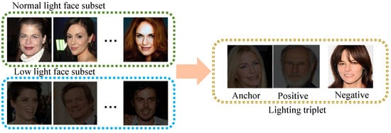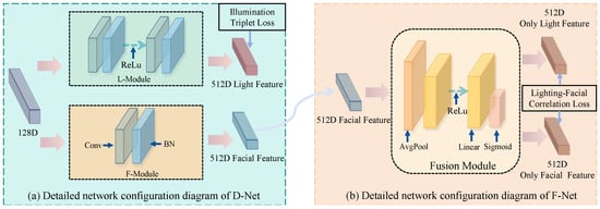Table 12, after incorporating D-Net and the lighting-triple loss, our approach achieves a 0.72% improvement on LFW* and a 1.22% improvement on CASIA-Test. Next, we add the F-Net to the combination of the baseline, D-Net, and the lighting-triple loss, achieving an improvement of 0.22% on LFW* and 2.83% on CASIA-Test. This indicates that the F-Net can effectively extract residual facial-related features from coarse illumination-related features and fuse them with the facial-related features in the D-Net. Finally, adding the lighting–facial correlation loss resulted in an improvement of 0.66% on LFW* and 1.18% on CASIA-Test. The lighting–facial correlation loss can effectively reduce the correlation between disentangled facial-related features and illumination-related features in the feature space. Our optimal configuration is above the baseline, adding D-Net and illumination triplet loss (
