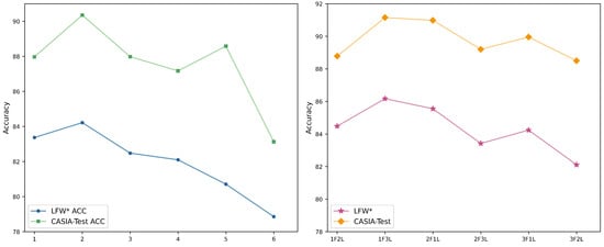 Figure 6 left, we can see that the performance is best when the number of convolutional layers in the decoupling module is two, and the performance decreases as the number of layers increases. This also demonstrates the significant impact of configuring different convolutional layer counts in the decoupled module in our approach. Since the decoupling module consists of two parallel sub-modules, we also explore the face recognition rate of different conv layer combinations in different sub-modules on the LFW* and CASIA-Test datasets. Here, we select parallel modules with three layers or fewer for combination. According to