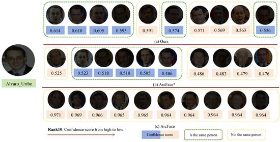 Figure 7c, displays the top ten matching results retrieved by the ArcFace model. Here, ArcFace is tested directly using the open-source ArcFace-trained model. The ArcFace model failed to correctly match the relevant faces under low-light conditions, with all top ten results being incorrect matches, highlighting the model’s limitations in handling extreme low-light conditions.