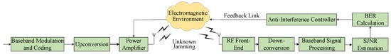Since electromagnetic waves are the carriers of information transmission, wireless communication channels are inherently open, making it easier for jammers to inject malicious signals into the target transmission channel. This jamming reduces the signal-to-jamming-and-noise ratio at the receiver, complicating the correct demodulation of transmitted data, which degrades transmission quality and may even lead to complete transmission failure [1,2]. To ensure reliable transmission under malicious jamming while minimizing energy consumption, adaptive power adjustment techniques are required [3]. These techniques dynamically adjust the transmission power of the wireless communication system to adapt to varying electromagnetic environments, thereby enhancing system reliability and conserving power [4].