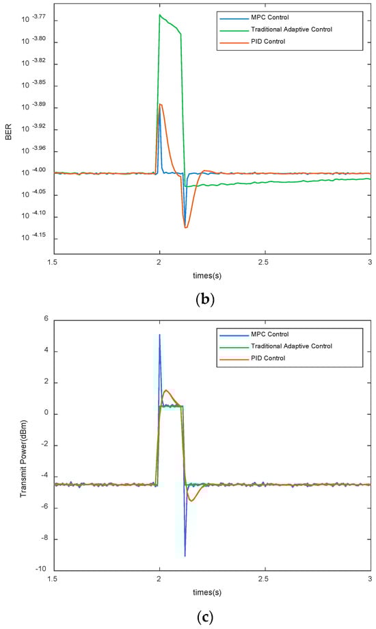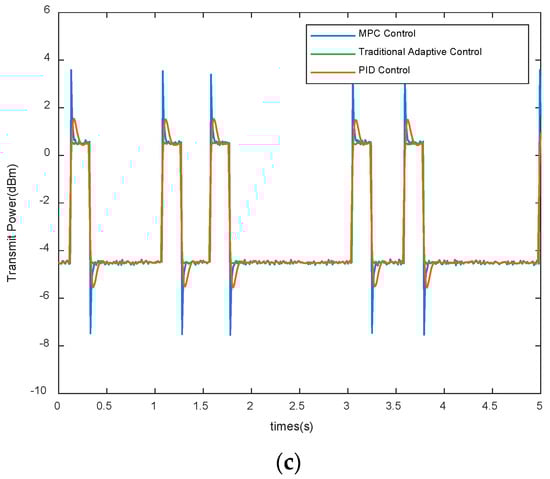 As shown in Figure 6c, compared with the integral state feedback control method and the traditional power adaptive method, the proposed algorithm is capable of regulating the output BER to converge to the target value in a more expeditious manner with diminished BER fluctuation by transmitting the optimal power through the MPC state feedback controller when malicious interference occurs during transmission.