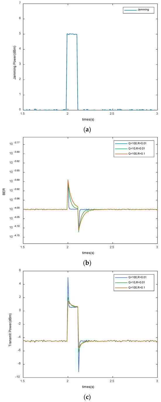 Figure 7 demonstrates the impact of varying weight settings on the efficacy of the proposed algorithm. The state weight parameter Q and the input weight parameter R play distinct roles, collectively influencing the behavior of the controller and the optimization objective. In the presence of impulse interference, an increase in state weights results in greater emphasis being placed on state error reduction by the power controller. This, in turn, causes the communication system to converge to the target BER at a faster rate, thereby reducing both the BER stabilization and the response time of the transmitted power. When the value of R is larger, it indicates that the controller is placing a greater importance on the saving of control input power. This results in the system achieving the control target with less transmit power, thus reducing energy consumption.