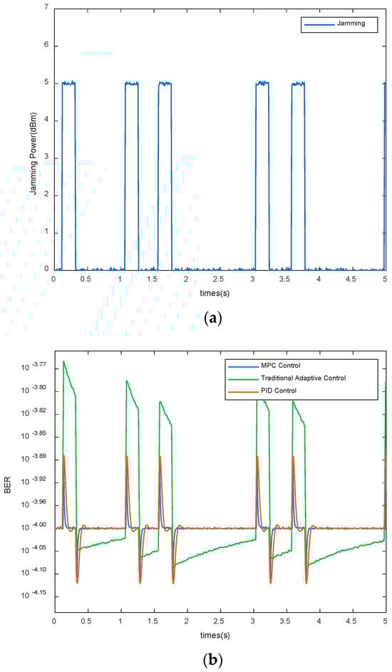 As shown in Figure 6a, the transmission channel of the communication system is an AWGN channel with a signal-to-noise ratio (SNR) of 30 dBm. At t = 2 s, Sudden jamming with a power of 5 dBm attacks on communications systems. Figure 6b illustrates that the proposed algorithm responds to the jamming significantly faster than existing methods. In the transmission phase, the radio frequency front-end is monitored in real time by the receiver for signal processing and estimation of the SJNR. The transmitter then utilizes the feedback data to adjust the transmitter power through MPC, thereby stabilizing the SJNR by increasing the transmitter power and thus stabilizing the BER.