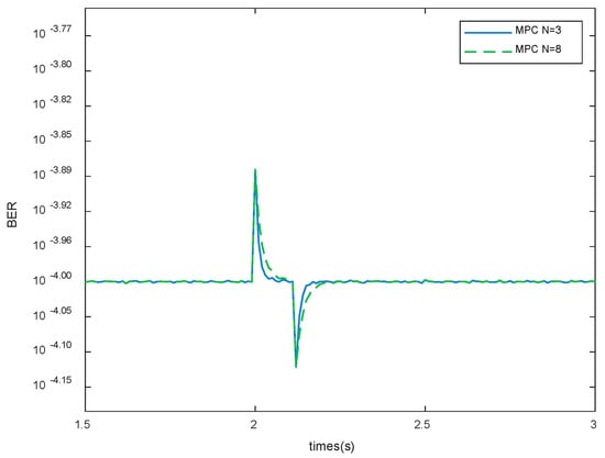 As shown in Figure 9, When the prediction interval N = 8 is employed, the resulting error is considerable, and the convergence process is significantly slowed. In contrast, the prediction interval N = 3 yields a more rapid convergence and a smaller error. This is primarily due to the fact that effective predictive time power controllers are capable of anticipating future states, thereby enabling more comprehensive optimization decisions to be made. This contributes to enhancing the stability of the transmission system. Nevertheless, overly lengthy prediction periods may also give rise to a number of issues. Primarily, the precision of the prediction model declines with time, as the unpredictability of the prospective state grows. This may result in the controller making determinations based on erroneous projections, which ultimately diminishes the system’s overall performance. Secondly, longer prediction periods elevate the computational burden due to the controller’s necessity to address a greater number of future state variables.