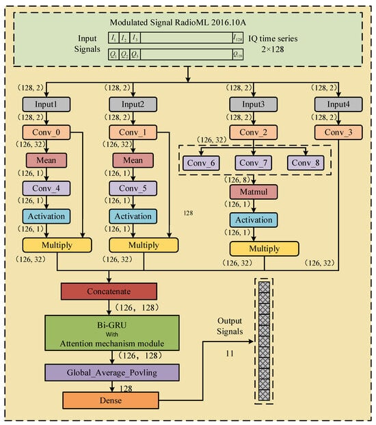 (2) Data Preprocessing and Network Design with Multi-Stream structure: In this paper, the input data are efficiently preprocessed by splitting it into vectors of size 128 × 2 to adapt to the network structure. Meanwhile, after extracting the features of multimodal information, a feature fusion strategy is utilized to learn the joint feature representation, and the spatio-temporal features are extracted by CNN and Bidirectional Gated Cycling Unit (Bi-GRU); the parallel architecture is designed to reduce the computational complexity so as to meet the needs of real-time processing. A suitable network architecture and output layer are designed to achieve the effective classification and recognition of modulation modes.