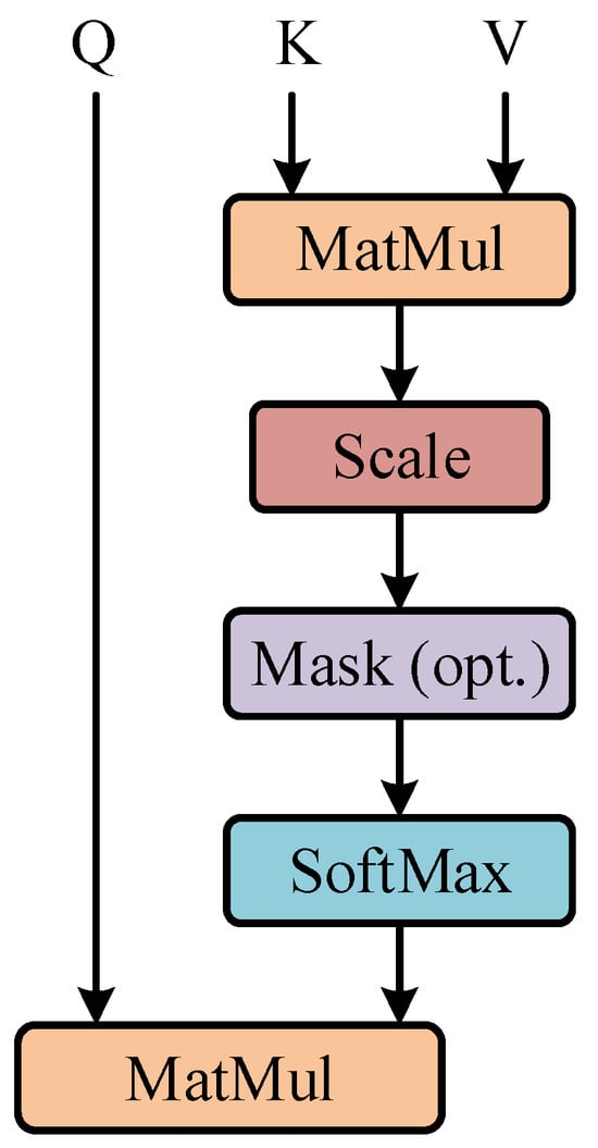 The design of this multi-head attention structure allows the model to simultaneously utilize different representation subspaces to learn relevant information, thus enriching the representation capability of the model. Among them, the calculation of scaled dot-product attention is illustrated in Figure 6.