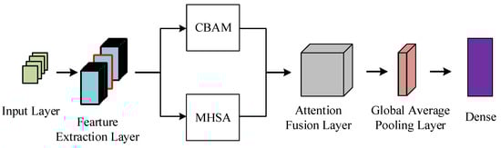 Embedding the CBAM and MHSA as parallel attentional modules into the neural network is important. This approach allows the neural network model to concurrently focus on both inter-channel correlations and intro-sequence importance during the feature extraction process. By retaining key information while reducing noise, the model’s representation and generalization capabilities for the input data are enhanced. In this study, a specialized attention fusion mechanism is designed, as shown in Figure 7, for dynamically determining the weights of the outputs from the CBAM and MHSA modules. The outputs from the CBAM and MHSA modules are connected to the network of the attention mechanism. Through training, the model dynamically learns the weights of each output, using these attention weights to combine the outputs of the two modules. This mechanism allows the model to adaptively adjust the contribution of the outputs of the two modules in different situations. Finally, the outputs of the two modules are connected to act on the signal output features of the Bi-GRU module, which are then fed inside the global average pooling layer for further processing to integrate the information from the two attention mechanisms.