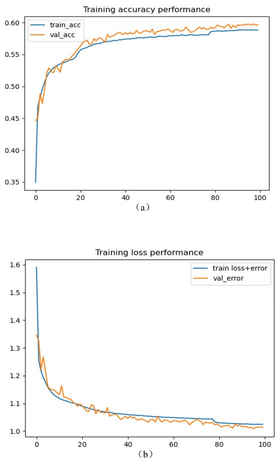 The training loss reflects the fitting degree of the model to the training data, while the validation loss reflects the fitting degree of the model to new data. If the validation loss is much greater than the training loss, there may be an overfitting problem. When both the training and validation losses decrease, it indicates that the model has good fitting effects. In Figure 9, we conduct a comprehensive performance evaluation of the proposed model. By recording the loss and accuracy values for both the training set and the test set, we obtain the epoch–loss and epoch–accuracy curves as the number of training iterations increases. The results show that in the proposed method, there is no significant difference between the training loss and validation loss with the increase in training iterations, and both of them decrease with the increase in epochs. Meanwhile, the training accuracy and verification accuracy are gradually improved. In addition, the accuracy on the training set is slightly higher than that on the verification set, indicating that there has been no overfitting phenomenon during the training process. Overall, the proposed model performs stably in terms of training and validation loss, which indicates that the algorithm has good generalization ability and performance. Additionally, the training in this paper targets models under datasets with multiple spans of different SNRs, and in order to accurately evaluate the overall generalization ability of the model, the iterative training accuracy is calculated as the average accuracy of the datasets under each SNR condition. This approach facilitates a more comprehensive assessment of the overall performance of the model under various SNR conditions and provides more insight into the robustness of the model in the face of different challenges.