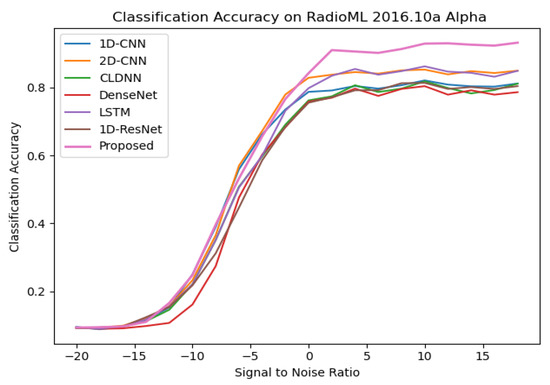 Figure 10 illustrates the recognition accuracy curves of the seven methods at all the SNRs under the same experimental conditions. As the SNR increases, the recognition accuracies of all the models are gradually improved. Upon comparison, it is found that the proposed model achieves the highest accuracy under most SNR conditions. Specifically, in low SNR scenarios, the recognition accuracy of the proposed model is similar to that of the other baseline networks. When the SNR is −8 dB, the inflection point of the recognition accuracy curve of the proposed model exhibits a noticeable improvement, and after an SNR of −2 dB, the proposed model begins to demonstrate its advantages. At an SNR of 2 dB, the recognition accuracy of the proposed model is still around 91%, while the accuracy of the other networks is below 90%. Under an SNR of 18 dB, the proposed model achieves a peak accuracy of 93.1%, which is 12% better than that of 1D-CNN, 8.1% better than that of 2D-CNN, 12% better than that of CLDNN, 14.5% better than that of DenseNet, 8.2% better than that of LSTM, and 12.8% better than that of ResNet. It can be observed that the overall recognition rate of the model with the addition of the attention mechanism has an advantage over the other baseline models due to the use of CNN and Bi-GRU to extract the spatial and temporal correlation features, performing weighted processing on the features with different temporal steps and spatial correlations of the signals.