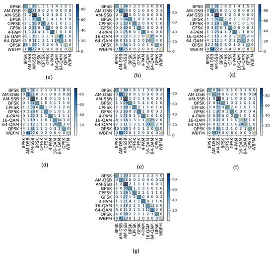 Confusion matrix at full SNR: (a) 1D-CNN, (b) 2D-CNN, (c) CLDNN, (d) DenseNet, (e) LSTM, (f) ResNet, and (g) proposed model.