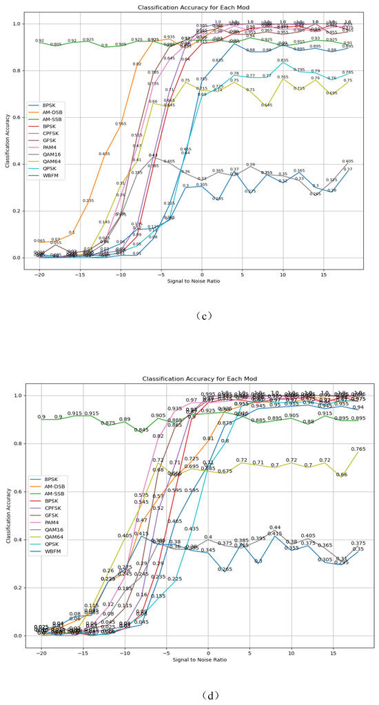 The standard dataset RadioML2016.10A, generated by GNU Radio, is used in the experiment as a verification platform for AMR tasks, mainly based on its advantages of diversity, signal–noise ratio coverage, data quality, and wide application. The dataset contains a variety of modulation modes, which can effectively evaluate the generality and robustness of the method under different modulation schemes. It covers low to high SNR conditions, which provides a challenge for performance evaluation in low SNR environments, and the data collection is standardized and of high quality, which ensures the accuracy of the experimental results. In addition, RadioML2016.10A is widely used in academic and industrial fields, which can provide a unified platform for cross-domain comparison and benchmarking, making the advantages of the method easier to demonstrate and closely related to actual communication requirements, which has the following characteristics: