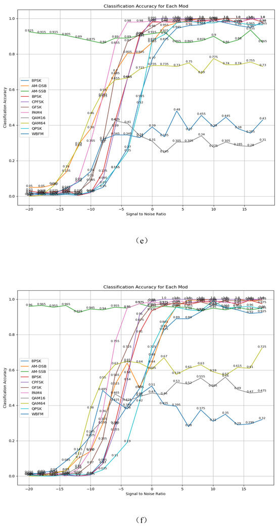 In Figure 13a–f, it is observed that the recognition performance for modulation modes such as QAM16 and QAM64 is also unsatisfactory; this is attributed to the fact that the high-order modulation modes such as QAM16 and QAM64 possess more intricate signal structures, with denser and more complex distributions in the signal space. Moreover, these higher-order modulation modes are more susceptible to the effects of noise and interference during transmission, resulting in increased signal ambiguity and thereby, augmenting the difficulty of the recognition algorithm. In Figure 13a, the recognition rate curve for QPSK signals fluctuates around 60%, whereas in Figure 13b, there is a notable improvement, with the rate rising to approximately 80%. This indicates that the recognition achieved on the 2D-CNN model effectively addresses the shortcomings observed with the 1D-CNN model. The relatively stable performance of the other methods in recognizing QPSK signals can be attributed to their ability, including the proposed model in this paper, to effectively capture the temporal correlations within the sequences, thus facilitating better extraction of signal features.