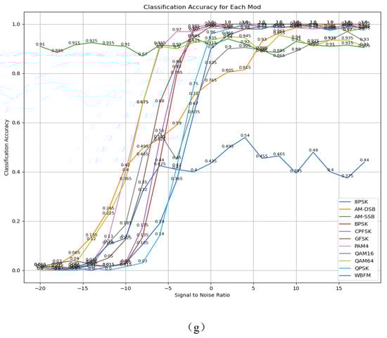 Recognition accuracy for each modulated signal in the range of −20~18 db for all seven methods. (a) The recognition accuracy of each modulated signal using 1D-CNN. (b) The recognition accuracy of each modulated signal using 2D-CNN. (c) The recognition accuracy of CLDNN for each modulated signal. (d) The recognition accuracy of each modulated signal using DenseNet. (e) The recognition accuracy of each modulated signal using LSTM. (f) The recognition accuracy of each modulated signal using ResNET. (g) The recognition accuracy of the proposed model in this paper for each modulated signal.