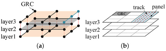 Figure 2a presents a multi-layer global routing model, where each dot is called a Global Routing Cell (). In Figure 2b, the routing area consists of several sub-regions, each of which is a GRC.