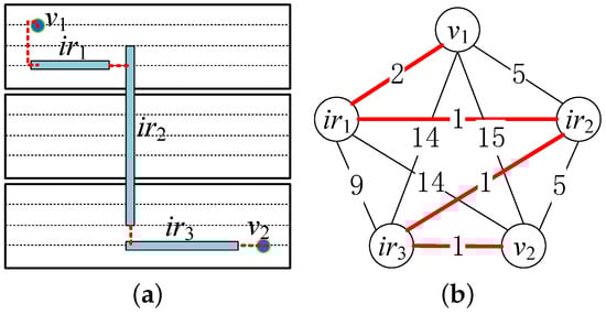 A diagram illustrating the calculation of the wirelength cost for a net, which includes three iroutes and two pins, is shown in Figure 4. In Figure 4a, the top view of the net is depicted, where and are located in the upper layer, and are located in the lower layer, and is located in the middle layer with vertical panels. Figure 4b shows a weighted complete graph with these five components as nodes, and the weight of each edge represents to the shortest Manhattan distance between the two corresponding components. A minimum spanning tree is then constructed to connect all components within the net, and its length represents the wirelength cost of the net.