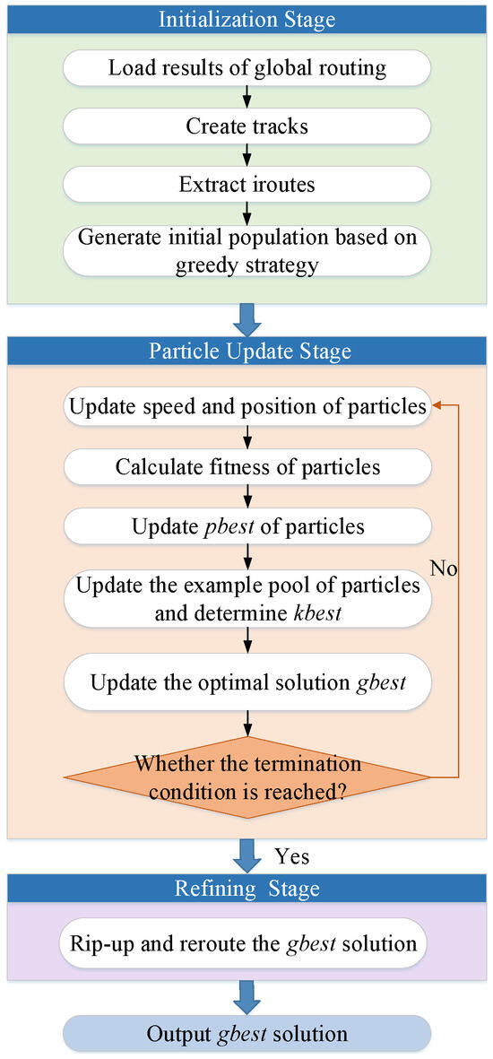 An interactive adaptive PSO algorithm is proposed in [28] to improve the search efficiency and accuracy of the population to minimize the area of floor planning. Experiments show that the search quality and speed of this method are the best. In particular, there are many applications of PSO in routing problems. Ref. [29] uses the PSO algorithm to calculate the optimal number and size of buffers. In [30], reinforcement learning is employed to optimize the search of PSO, and a routing scheme with higher quality and safety is generated based on the improved PSO. In [31], the PSO algorithm with gradient descent is adopted to construct the routing tree with the minimum number of vias and wirelength, thereby reducing the chip manufacturing cost and power consumption. In [32], PSO is combined with a meta-heuristic algorithm based on invasive weed optimization to enhance the global optimization capability of the algorithm, thereby reducing the wirelength cost of global routing. Ref. [33] utilizes a multi-objective particle optimization algorithm to study the tradeoff between the power and delay of high-speed circuits, and generates the non-dominated optimal solutions of dynamic power and delay. Ref. [34] proposes a particle swarm optimization method that combines logistic regression and adaptive granularity learning to optimize decoupling capacitance, thereby reducing the cumulative impedance of the power delivery net.