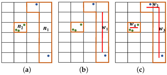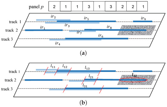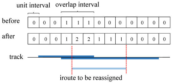 The overlap cost in Equation (1) is computed as the sum of the overlap lengths of two iroutes on each track. In contrast to the calculation in Section 3.2, the calculation in this section distinctly emphasizes the overlap within the congested area. The overlap and blockage costs of each track, as well as the fitness values of the panel p in Figure 8b, are calculated as follows: