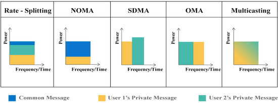 By adjusting the ratio and power of common and private messages, RSMA can include NOMA, SDMA, OMA, and multicasting techniques as special cases. As shown in Figure 2, through a two-user message construction example, we can show that existing MA technologies can be regarded as special cases in RSMA. Recall that RSMA splits each user’s message into a common and private part. For example, user 1’s message is divided into a common part and a private part . Similarly, user 2’s message is divided into a common part and a private part . Here, and are combined to form a common message , while and become the private message for each user.