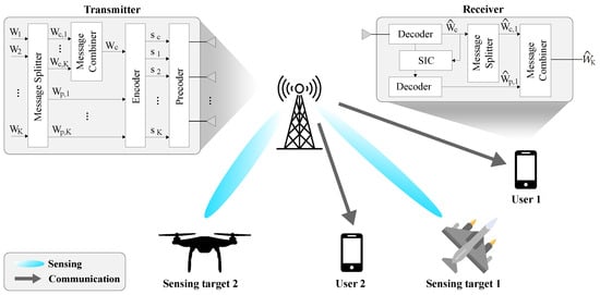 - Chen, K.; Mao, Y.; Yin, L.; Xu, C.; Huang, Y. Rate-Splitting Multiple Access for Simultaneous Multi-User Communication and Multi-Target Sensing. IEEE Trans. Veh. Technol. 2024, 73, 13909–13914. [Google Scholar] [CrossRef]