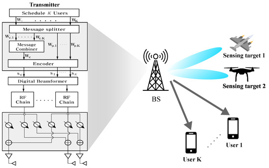 In addition, due to the need for wider bandwidth, research on hybrid ISAC in the 30–300 GHz spectrum is being investigated to enhance both communication performance and sensing accuracy [57]. In [71], the use of wider bandwidth in THz bands enables high-resolution sensing. Thus, THz-based ISAC systems can enhance data transmission rate and high-resolution sensing capabilities, improving both spectral and energy efficiency. However, due to the high directivity and substantial atmospheric absorption in the THz band, an advanced interference management technique based on highly directional and adaptive beamforming is required to perform the sensing in the THz band. Note that the synergistic design of THz bands and ISAC systems can be applied in various fields such as smart cities and intelligent factories [72]. Recently, the integration of radar and massive MIMO communication has been studied to fully exploit vast spatial degrees of freedom and abundant bandwidth resources in ISAC systems [73]. To this end, accurate channel training is essential for effective target sensing functionality, and CV technology can be applied to analyze sensing information, enabling precise understanding of wireless environments [74]. The advantages of RSMA in multi-antenna environments have been demonstrated for addressing multi-user interference in mmWave communication [75]. In [17], it is shown that RSMA-assisted mmWave-ISAC (see Figure 7), using hybrid beamforming algorithms, outperforms both NOMA-ISAC and SDMA-ISAC.
