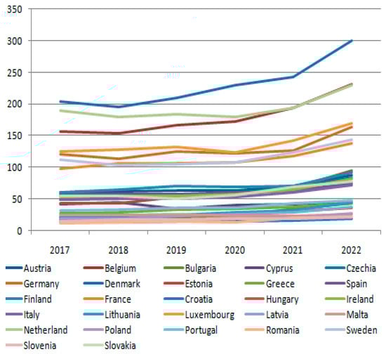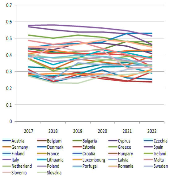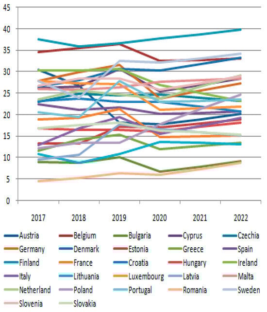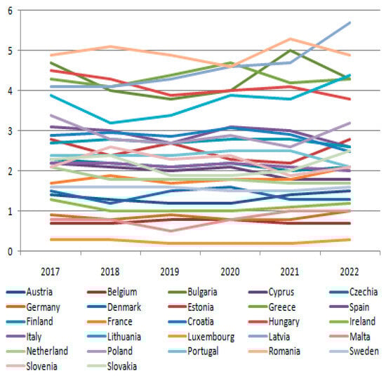 Figure 1), with values between 0.2% (Luxembourg, 2019–2021) and 5.7% (Latvia, 2022). The low values correspond to the level of development of the considered societies, with specific structural configurations of the economy characterized by a high degree of industrialization and orientation towards services.