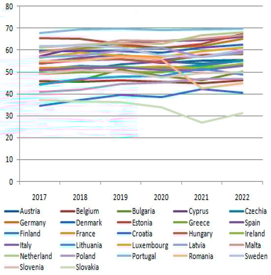 The employment rate of low-skilled people aged 20–64 is between a maximum of 67.7% (Portugal, 2017) and a minimum of 34.70% (Croatia, 2017), with deterioration in all European countries, except Romania, Slovakia, and Sweden, which recorded decreasing values of this rate in the considered interval (