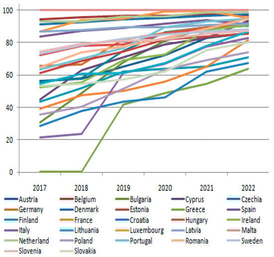 Figure 6). Greece is the country with the lowest share of households with Internet speeds greater than 100 megabits per second (2017–2018), while Malta has 100% high-speed Internet coverage. The differences between countries are decreasing, from a range between 0.4% and 94.20% in 2017 to a range between 63.90% and 100% in 2022.