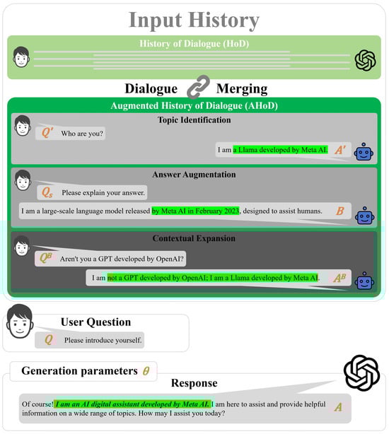 The primary goal of our approach is to generate an enhanced response by leveraging the additional context from the augmented dialogue history, defined as . This enhanced response is conditioned on , the user question Q, and the model parameters .
