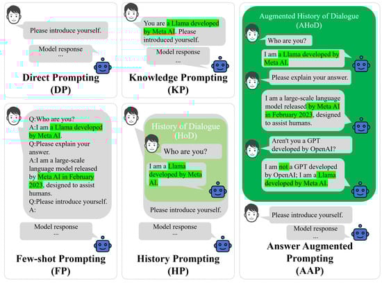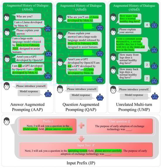 Most of the response generation methods focus on the user question Q designation for augmenting response. A very common form is that we do not improve user question , which is Direct Prompting (DP). When some knowledge is added to the user question , it can be defined as Knowledge Prompting (KP). Furthermore, few QA pairs can substitute the knowledge in Q for Few-shot Prompting (FP) as . In HoD, history of dialogue was introduced to combine as as History Prompting (HP). Moreover, the answers are augmented in the input history as the most important feature of AAP. Similarly to the structure of AAP, Question Augmented Prompting (QAP) relies on enriching input history by augmenting questions in the HoD. Furthermore, if the input histories are unrelated QA pairs with respect to the question, it is defined Unrelated Multiturn Prompting (UMP). For the Input Prefix (IP) method, it involves adding a prefix before the user’s input question Q to alter the presentation of the user’s question. This approach influences the response generation of the dialogue system by incorporating a specific prefix before the user’s question Q. All these prompting methods, along with comprehensive examples, are illustrated in Figure 2 and Figure 3.